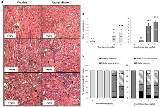 Bontemps, A.; Conquet, L.; Elie, C.; Magneron, V.; Gloaguen, C.; Kereselidze, D.; Tack, K.; Barbier, O.C.; Guéguen, Y. In Vivo Comparison of the Phenotypic Aspects and Molecular Mechanisms of Two Nephrotoxic Agents, Sodium Fluoride and Uranyl Nitrate. Int. J. Environ. Res. Public Health 2019, 16, 1136. https://doi.org/10.3390/ijerph16071136