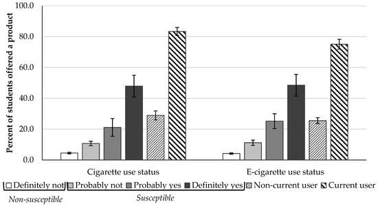 Susceptible and even non-susceptible never users are at risk of future cigarette and e-cigarette use if they are receiving offers of these products. Longitudinal data indicate that non-smoking students who receive offers of cigarettes are more likely to initiate cigarette smoking [11,12]. However, differences in the risk of initiating smoking when offered cigarettes according to susceptibility to future smoking have not been explored in longitudinal studies. The current results suggest this may be an important investigation for future studies. A low percentage of students who would “definitely not” use cigarettes or e-cigarettes if their best friend offered it reported receiving offers relative to students who would “probably” or “definitely” use the product. Although these data are cross-sectional, it is possible that measures of offers of cigarettes and e-cigarettes may provide insight in identifying students at risk of initiating cigarette and e-cigarette use in addition to current measures of susceptibility. Longitudinal data are needed to evaluate the predictive ability of such measures to future product use and the discriminant validity compared to current measures of susceptibility to future product use. Furthermore, such data would help to clarify the potential bidirectional association that may exist between susceptibility to future product use and product offers.