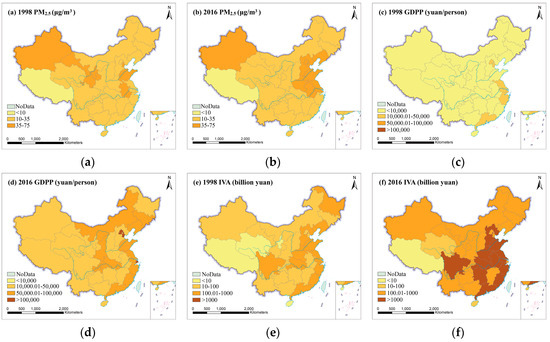 From Figure 1, 31 provinces in China were classified and mapped according to the values of PM2.5 and socioeconomic factors. From Figure 1a, it could be found that PM2.5 concentration only in Tibet met the WHO Air Quality Guideline (AQG) level (10 μg/m3) in 1998. PM2.5 concentration in most provinces were observed between 10 μg/m3 and 35 μg/m3. Furthermore, PM2.5 concentration in some provinces, such as Tianjin, Anhui, Shandong, Gansu, Ningxia, and Xinjiang, were found to be higher than 35 μg/m3. From Figure 1b, in 2016, obvious changes mainly occurred in some provinces of China. For example, PM2.5 concentration increased obviously (>35 μg/m3) in Liaoning, Beijing Hebei, Jiangsu, Shanghai and Henan; however, PM2.5 concentrations in Gansu and Ningxia were found to have fallen below 35 μg/m3. The distributions of socioeconomic factors were similar to the distribution of PM2.5 both in 1998 and 2016 generally. From Figure 1c,d, provinces with GDPP below 10,000 yuan accounted for more than 80% in 1998. Obviously, GDPP in all provinces was higher than 10,000 yuan in 2016, some of which had a GDPP of more than 100,000 yuan, such as Shanghai, Beijing and Tianjin. Figure 1e,f show that IVA increased rapidly in most provinces of China, especially in North China, East China, Central China and Northeast China. The UPD exceeded 2000 person/per square kilometer only in Shanghai, Jiangsu, Beijing and Qinghai in 1998 (Figure 1g). In 2016, the UPD in most provinces was higher than 2000 person/per square kilometer, and some provinces even exceeded 3000 person/per square kilometer (Figure 1h). From Figure 1i,j, we could find that PCO in Mainland China was less than 1 million in 1998. PCO in 31 provinces was more than 1 million, except Tibet and Qinghai in 2016.