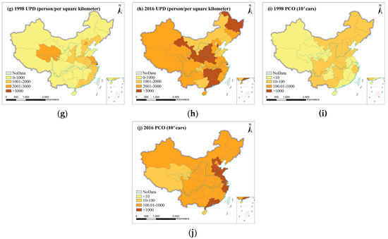 Spatial distribution of socioeconomic factors and PM2.5 in 31 provinces of China in 1998 and 2016. (a) 1998 PM2.5, (b) 2016 PM2.5, (c) 1998 GDP per capita, (d) 2016 GDP per capita, (e) 1998 industrial added values, (f) 2016 industrial added values, (g) 1998 urban population density, (h) 2016 urban population density, (i) 1998 private car ownership, (j) 2016 private car ownership.