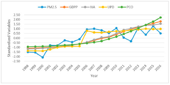 Temporal variations of standardized PM2.5, GDP per capita (GDPP), industrial added values (IVA), urban population density (UPD) and private car ownership (PCO) in Mainland China Figure 1998 to 2016.