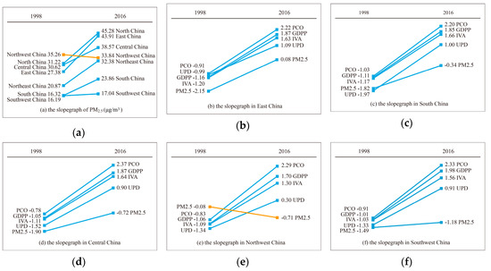 The seven regions of China are showed in Figure 3. From Table 1, in 1998, the GDPP and UPD in East China and North China, the IVA in East China, and the PCO in North China and Central China were far higher than other geographical subareas. The GDPP, IVA, UPD, and PCO in Northwest China were relatively lower. However, Northwest China had the highest PM2.5 concentration (35.26 μg/m3). In 2016, compared with other regions, GDPP in East China and North China, and IVA in East China were still relatively higher. Notably, East China had the most private cars. Central China was the most densely populated. North China became the region with the highest PM2.5 concentration, followed by East China. To better analyze the variation of PM2.5 (GDPP, IVA, UPD or PCO) in seven sub-regions, this slopegraph in Figure 4 can be used to show the increases/decreases between just two fixed points (1998 and 2016) for different factors. Most importantly, slopegraph focused on the overall macro change between two periods points, not changes in each year or intervening period. Slopegraph is a great visualization method for focusing on that aspect of the macro change.