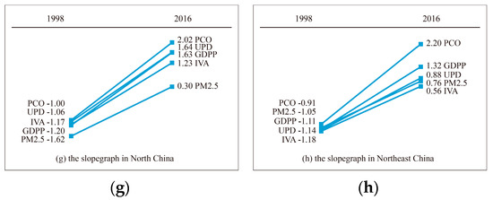 The slopegraph for explaining standardized annual mean PM2.5 concentration, standardized socioeconomic factors changes 1998 vs. 2016, (a) the slopegraph of PM2.5 in the seven geographical subareas, (b) the slopegraph of PM2.5 and socioeconomic factors in East China, (c) South China, (d) Central China, (e) Northwest China, (f) Southwest China, (g) North China, and (h) Northeast China.
