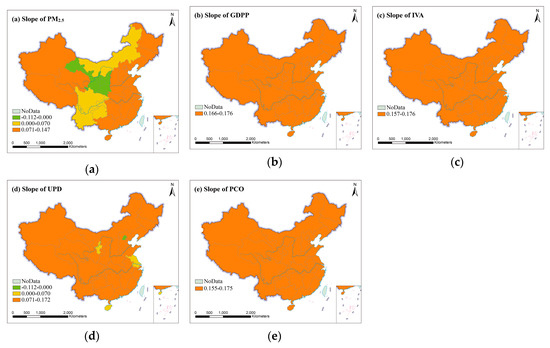 The slope of (a) PM2.5, (b) GDPP, (c) IVA, (d) UPD and (e) PCO from 1998 to 2016.