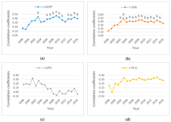 The correlation coefficients between PM2.5 and socioeconomic factors in Mainland China, 1998–2016. (a) Correlation coefficients between PM2.5 and GDPP. (b) Correlation coefficients between PM2.5 and IVA. (c) Correlation coefficients between PM2.5 and UPD. (d) Correlation coefficients between PM2.5 and PCO. Notes: the letters a and b above the curve point represent coefficients significant at the 1%, 5% levels, respectively. No letters above the curve point indicate insignificance.