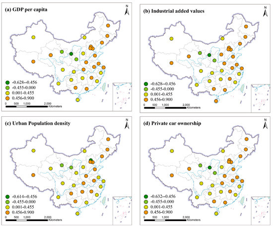 In the Figure 7, dark green represents a significant negative correlation, light green is a negative correlation, dark yellow means a significant positive correlation, and pale yellow represents a positive correlation. From Figure 7, PM2.5 in most provinces of Northeast China, North China, Central China, East China and South China showed a significantly positive correlation with GDPP, IVA, and PCO. But PM2.5 only in Ningxia was significantly negatively correlated with GDPP, IVA, and PCO. Most provinces of Northeast China, North China, Central China and East China showed significantly positive correlations between PM2.5 and UPD. However, PM2.5 had a negative correlation with UPD in Beijing, Gansu and Ningxia. Especially in Beijing, PM2.5 was significantly negative correlated with UPD. These indicated that socioeconomic factors have contributed to the increased PM2.5 in most provinces. But the impacts of GDPP, IVA, and PCO on PM2.5 in Shaanxi, Gansu and Ningxia were negative; and PM2.5 of Gansu, Ningxia and Beijing were affected negatively by UPD. All of these illustrate the existence of spatial heterogeneity.