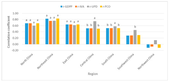 The correlation coefficient (r) values between PM2.5 and GDPP (IVA, UPD or PCO) in the geographical subareas. Notes: a, b represent coefficients significant at the 1%, 5% levels, respectively. No letters above the bar chart indicate insignificance.