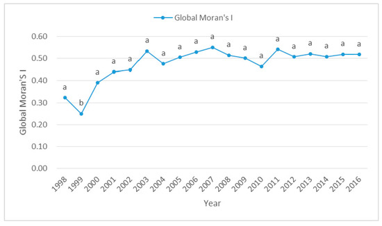 Global Moran’s I of PM2.5 concentration for 31 provinces, 1998–2016. Notes: a, b represent coefficients significant at the 1%, 5% levels, respectively.