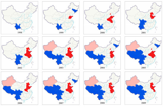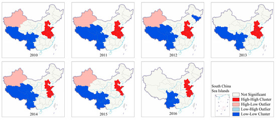 From Figure 9, the global Moran’s I values of PM2.5 were positive at the 95% confidence level and increased over time, but fluctuated around 0.5 since 2003, indicating that PM2.5 exibited significantly positive spatial autocorrelation and spatial homogeneous, and spatial autocorrelation of PM2.5 in 31 provinces of China strengthened gradually. In other words, PM2.5 at one province tended to be similar to those of their neighboring provinces, the spatial spillover effect had been increasing in different provinces.