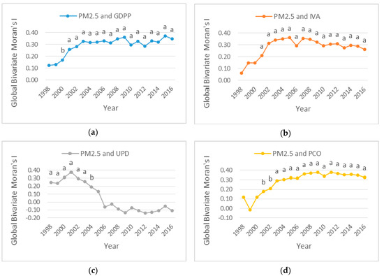 Global Bivariate Moran’s I for province-level between PM2.5 and socioeconomic factors in Mainland China, 1998–2016. (a) Global Bivariate Moran’s I between PM2.5 and GDPP. (b) Global Bivariate Moran’s I between PM2.5 and IVA. (c) Global Bivariate Moran’s I between PM2.5 and UPD. (d) Global Bivariate Moran’s I between PM2.5 and PCO. Notes: the letters a and b above the curve point represent coefficients significant at the 1%, 5% levels, respectively. No letters above the curve point indicate insignificance.