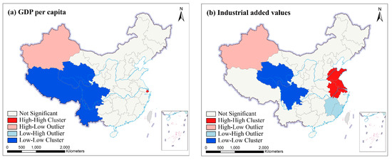Figure 12 showed the local bivariate cluster maps for PM2.5 and socioeconomic factors in 31 provinces of China, in 2016. For the provinces of the HH clusters, the development of the social economy in their adjacent provinces had positive radiation effect on these provinces. Their economic development in the local provinces have also brought about a number of pollution sources that have indirectly increased PM2.5. Some provinces with slow economic growth in Northwestern and Southwestern China had fewer pollution sources, which was easy to form LL clusters. Furthermore, the HL type provinces were mainly distributed in Xinjiang in Figure 10 and Figure 12. As a region of severe sandstorm and abundant coal resources, the exploitation and utilization of these coal resources have produced many pollutants in Xinjiang and destroyed the ecological balance of atmospheric environment. The complex topography of Xinjiang is also not conducive to the diffusion of atmospheric pollutants. In addition, Qinghai and Tibet with underdeveloped industry have less pollution resources and lower PM2.5 concentration. Rich vegetation in Sichuan and Yunnan can effectively reduce PM2.5 concentration. The combination of these factors formed the obvious HL outliers around Xinjiang.
