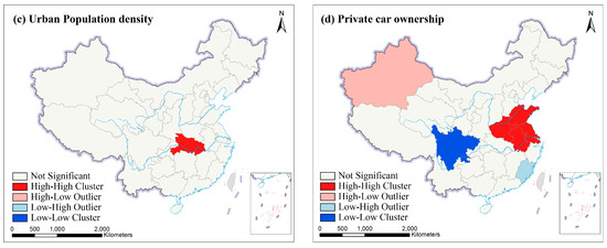 In this paper, global bivariate Moran’s I was used to determine if PM2.5 in one province were spatial correlated with socioeconomic factors of its neighbors across the study region. From Figure 11a,b,d, the global bivariate Moran’s I values presented positive growth trends at a 95% confidence level in 1998–2016. These indicated that spatial correlations between PM2.5 at a province and GDPP, IVA and PCO of its adjacent provinces were positive and significant, and the positive spatial correlations increased during the study period. From Figure 11c, the global bivariate Moran’s I values presented a positive increasing trend in 1998–2001, a positive decreasing trend in 2001–2005, and a negative decreasing trend in 2006–2016, with the p-values less than 0.05 in 1998–2004, indicating that spatial correlation between PM2.5 concentration at a province and UPD of its neighboring provinces was positive and significant in 1998–2004, positive but not significant in 2005, negative but not significant in 2006–2016. The spatial correlation decreased from 2001.