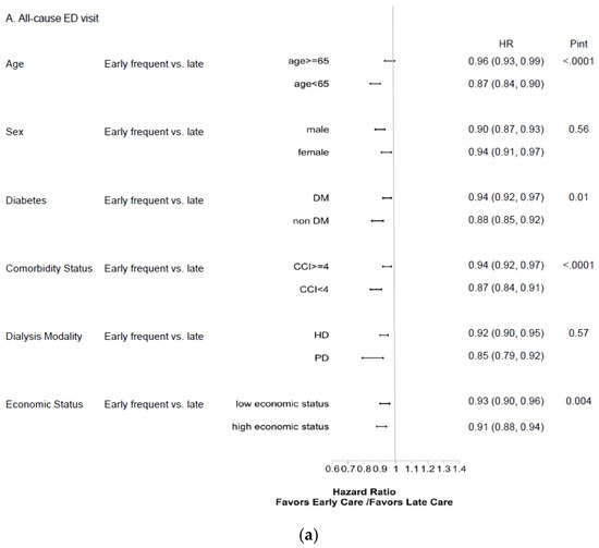 Subgroup analysis of hazard ratio for 1-year ED visit between the early-frequent and late-nephrology-care groups for first event of (a) all-cause, (b) infection-related, and (c) potentially avoidable ED visit. Abbreviations: ED, emergency department; CCI, Deyo’s Charlson Comorbidity Index; DM, diabetes mellitus; HD, hemodialysis; HR, hazard ratio; PD, peritoneal dialysis; Pint, p value for interaction term.
