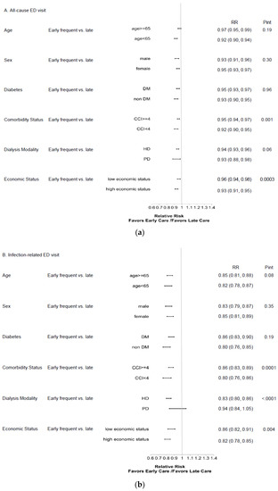 Early referral can help to slow the progression to ESRD and diminished renal function [5,6]. It has also been associated with reduced healthcare costs [7], reduced risk of cardiovascular events [8], reduced risk of early technique failure [9], and lower hospitalization and mortality rates [5,10,11,12,13,14]. Patients who receive an early referral tend to enjoy more quality-adjusted life-years (QALYs) [15], superior placement of dialysis access [12,16], and greater freedom in the selection of dialysis modality [17]. However, the association between patterns in predialysis care and visits to the emergency department (ED) has yet to be elucidated.
