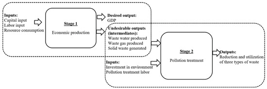 DEA proposed by Charnes et al. [33] has been used to measure efficiency that considers only the inputs consumed and final outputs produced, ignoring links among sub-DMUs, thus making it difficult to identify ways for DMUs to improve their performance. Therefore, traditional DEA models, such as undesirable-SBM and CCR models [34], apply only to the single-stage efficiency of a system. However, in most real-world situations, DMUs can perform several functions and be separated into different components in series. The entire production process usually includes both economic production and pollution treatment (Figure 1). In this case, some components play important roles in generating outputs by investing intermediate outputs obtained from previous components. Therefore, we proposed a DEA network model that deals with chain relationships among sub-DMUs to measure the environmental–economic efficiency of a two-stage process [35,36].