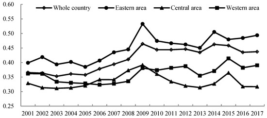 Figure 2 shows the changing trends of overall E_EFCY in the eastern, central, and western regions and the entire country from 2001 to 2017. Overall, E_EFCY showed a gradual upward trend, increasing by 4.2%, from 0.367 in 2001 to 0.409 in 2017. This revealed a significant improvement in the overall environmental–economic efficiency in recent years. Only the eastern region’s average E_EFCY was greater than the national average. The E_EFCY of the eastern region increased considerably over the study period, with an average increase of 9.49%, compared to increase of 2.84% and decrease of 1.18% in the western and central regions, respectively. This suggests that the increase in the overall environmental–economic efficiency of the country as a whole was mainly attributable to the improvement in efficiency in the eastern region. Two factors may contribute to this result: First, it is influenced by the imbalance of economic development, as the eastern region is more developed than the central and western regions. Second, as the eastern region’s industrial structure gradually matures, industries from the eastern region that mostly comprise of high-pollution and -energy consumption sectors are transferred to the western and central regions [30].