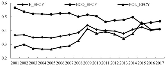 Changing trends of economic production efficiency (ECO_EFCY), pollution treatment efficiency (POL_EFCY), and overall environmental–economic efficiency (E_EFCY) in China from 2001 to 2017.