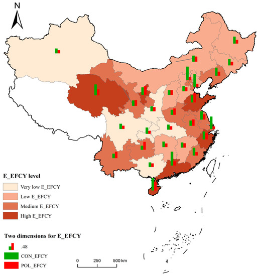 Based on its average score, E_EFCY in the 30 provinces was divided into four levels (high, medium, low, and very low) using the natural breaks classification method (Figure 4) [53]. As shown in Figure 4, provinces with low or very low E_EFCY are mainly located in the northwestern and central regions of China, whereas provinces with medium or high E_EFCY performance are mainly located in the eastern region. Furthermore, mainly in the eastern provinces, the scores of ECO_EFCY were higher than those of POL_EFCY. In contrast, provinces with higher values of POL_EFCY are located in northwestern China. More specifically, some coastal provinces, such as Beijing, Tianjin, Shanghai, and Guangdong, performed well in ECO_EFCY, with average efficiency values of above 0.9, whereas POL_EFCY scores in these provinces were relatively low, with average scores of less than 0.4. This implied that, with current production technology, the overall POL_EFCY in these regions could be improved by more than 60%. However, the scores of POL_EFCY in Hebei, Shanxi, Henan, Yunnan, and Anhui were greater than 0.6, but low ECO_EFCY scores (less than 0.4) led to a moderate overall E_EFCY in these provinces. The heterogeneity of many aspects, such as clean production technology, industrial structure, and environmental regulation, may have resulted in this phenomenon [54]. The technological and management levels of the eastern region are relatively higher, which plays an essential role in reducing resource consumption and mitigating environmental pollution stemming from production. Moreover, the rapid economic development in the developed areas expands the demand for large investments in high-tech industries, which further promotes technological progress and enhances resource utilization.