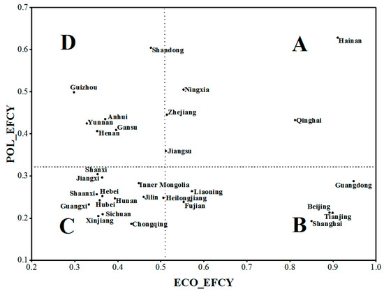 The estimated scores of ECO_EFCY and POL_EFCY can be used to identify potential gaps in E_EFCY in the examined provinces and provide specific policy implications for managing regional economic activities. Using the recognized framework of environmental–economic efficiency, which comprises ECO_EFCY and POL_EFCY, we present the most detailed comparative study to date on E_EFCY in Chinese provinces. We plotted two dimensions of E_EFCY to analyze the gap between the dimensions, help discern the locations of the main dimensions influencing E_EFCY and provide improvement strategies at the provincial level (Figure 5). To overcome the problem of selecting arbitrary thresholds for distinguishing high and low ECO_EFCY and POL_EFCY, data were classified based on mean values. The E_EFCY in the 30 provinces were classified into four types: Type A: high ECO_EFCY and high POL_EFCY; Type B: high ECO_EFCY and low POL_EFCY; Type C: low ECO_EFCY and low POL_EFCY; and Type D: low ECO_EFCY and high POL_EFCY.