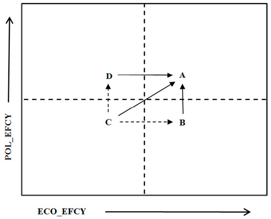 Type B–D provinces have three possible paths for improving efficiencies in such a way that will result in high ECO_EFCY and high POL_EFCY (Figure 6). Path 1 is a unilateral optimization path (B→A; D→A). Type B and C provinces can improve their environmental–economic efficiency by decreasing the disparity with Type A provinces in terms of one weak dimension. Path 2 is a gradually increasing path (C→D→A; C→B→A), where Type C provinces adopt the aforementioned specific policies and flexible measures to first evolve into Types B or D and sequentially progress to Type A. Path 3 is an aggressive optimization path (C→A) that requires provinces to efficiently address weaknesses at each stage of their economic activities simultaneously.