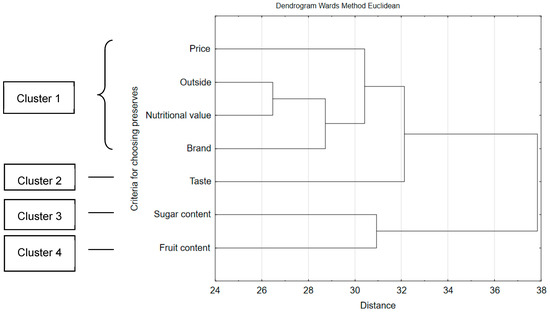 While choosing fruit preserves, the consumers would follow different factors. Calculations based on multi-dimensional cluster analysis demonstrate that they can be grouped according to the frequency of indications (Figure 1). Fruit content had the biggest influence on making the choice (cluster 4, 61.75% of consumers), next the taste (cluster 2, 48.5%) as well as sugar content (cluster 3, 42.8%). The following would matter the least for Polish consumers: price, outside, nutritional value and brand (cluster 1, 26.6%).