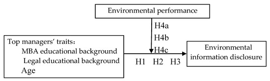 From the perspective of voluntary disclosure, some studies believe that EID is an important way for companies to reduce information asymmetry with their stakeholders, so companies with good environmental performance will release environmental information proactively [47]. From the perspective of legitimacy theory, studies suggest that EID is a tool for companies to maintain their legitimacy, therefore companies with poor environmental performance will more incline to release information to wash themselves green [52]. The empirical research provides supports for the above theories respectively [27,28,29,30,31,32,33,34]. Considering the findings mentioned above, we argue that companies’ environmental performance plays an important role when executives make their EID decisions. When companies’ environmental performance is better, executives will be more inclined to release environmental information to reduce information asymmetry and publicize a good company image; when companies’ environmental performance is poor, executives will also be inclined to issue environmental information reports to improve company image through this way. Therefore, environmental performance plays a U-shaped moderating effect in the relationship between top managers’ attributes and EID. Subsequently, the following hypotheses are proposed: