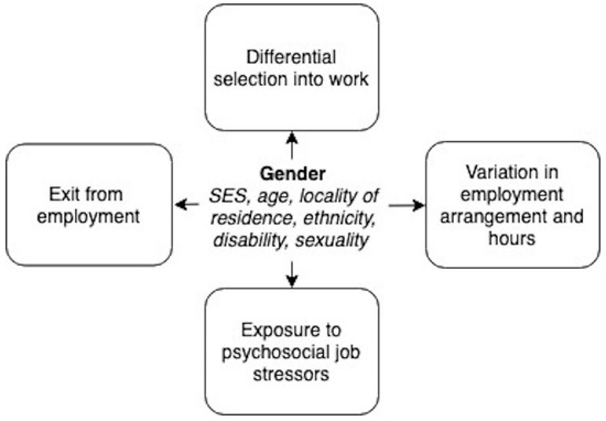 There are of course a multitude of perspectives on how the relationship between gender and employment have evolved and continue to evolve over time, but we are particularly interested in the issues of differences in exposure to various aspects of work, such as the type of work undertaken, working arrangements, psychosocial exposures while at work, and differences in how women and men exit from work. It is perhaps most simple to imagine this concept from a life course perspective, starting when young people enter employment and continue throughout their working life. For example, women may be selected into more female dominated occupations, which determines their exposure to certain working arrangements, pay and psychosocial working conditions. Employment in these jobs may contribute to different reasons for leaving the workforce, for either unemployment or other reasons such as to care for dependents. It is also necessary to highlight the fact that there may be differences in physical and biological exposures experienced by men and women, although in this in this article, we are particularly interested in psychosocial exposures.