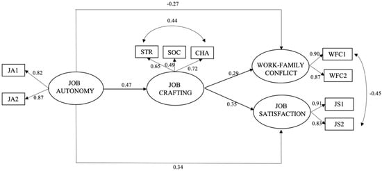 Deepening the model (Figure 1), job autonomy is directly associated with all variables, in particular positively with job crafting (β = 0.47), and with job satisfaction (β = 0.34), and negatively with work-family conflict (β = −0.27), thus confirming hypothesis 1 and hypothesis 2a and 2b. Job crafting shows positive and significant associations with both job satisfaction (β = 0.35), and work-family conflict (β = 0.29), confirming hypotheses 3a and 3b.