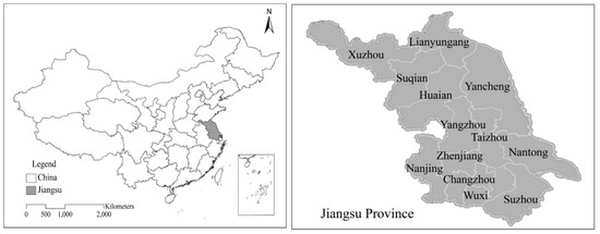 Location of Jiangsu Province in China (of China’s 9.6 million km2, Jiangsu covers 107,200 km2. The area of 13 cities in Jiangsu are as follows: Nanjing with a total area of 6587 km2, Wuxi with 4628 km2, Xuzhou with 11,258 km2, Changzhou with 4385 km2, Nantong with 8544 km2, Suzhou with 8488.42 km2, Lianyungang with 7615 km2, Huaian with 10,072 km2, Yancheng with 17,000 km2, Yangzhou with 6591.21 km2, Zhenjiang with 3848 km2, Taizhou with 5787.26 km2, Suqian with 8555 km2).