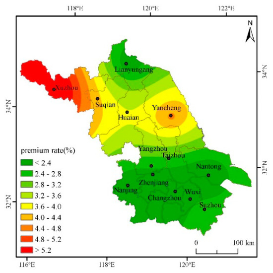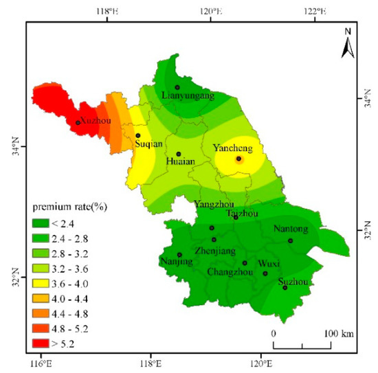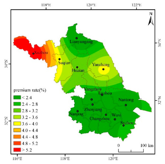 From Figure 3, with a 5% deductible, the province’s actuarially fair premium rate is between 1.80% and 6.12%, which is lower than the 2.5% deductible. The actuarially fair premium rate in the southeast region of Jiangsu is still the lowest, lower than 2.7%.