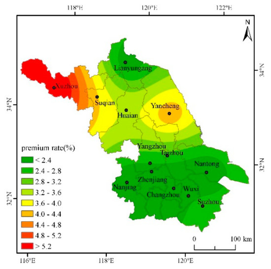 In order to fully calculate the actuarially fair premium rates for cities in Jiangsu, the actuarially fair premium rates for deductibles of 2.5%, 5%, 7.5%, and 10%, respectively, will be calculated below. According to the regression results and the actual production of single-season rice in Jiangsu, the safety surcharge rate is set as 20%, the profit rate 5%, and the operating cost surcharge rate 15%, then the gross insurance premium rate = actuarially fair premium rate × 1.45. The Kriging interpolation method and ArcGIS software mapping are used to intuitively describe the classification of actuarially fair premium rates under various deductibles for each city in the province, and then different risk areas are divided (Based on the data of seven other prefecture-level cities such as Nanjing and Suzhou in Jiangsu Province, this paper interpolates and estimates the actuarially fair premium rates of the five cities of Taizhou, Suqian, Huai’an, Yangzhou and Zhenjiang [31]) (Table 2).