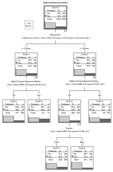Finally, in order to make it possible to interpret the associations we found and find other specific subgroups and relationships that may not be observed through a regression analysis, we made a classification tree (Figure 1). Here, we introduced emotional instability as a dichotomous dependent variable (normal Percentile <80 = 0; unstable Percentile ≥80 = 1), whereas the age groups (force first variable), the four EA-H factors, and gender were used as dichotomous independent variables (maternal/paternal affect and communication; maternal/paternal criticism and rejection; normal Percentile <80 = 0; High Percentile ≥80 = 1).