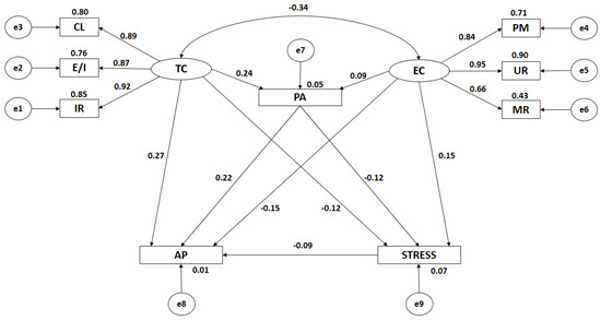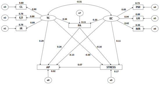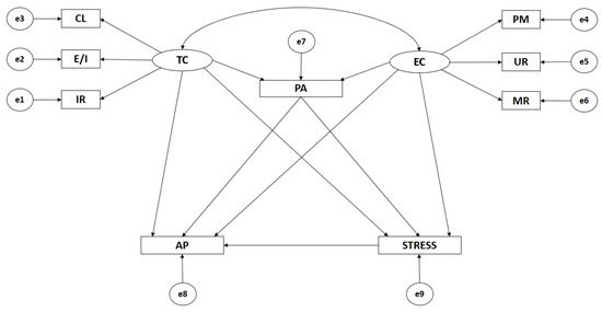 Task climate (TC) and ego climate (EC) act as exogenous variables with each one being inferred by three indicators. The indicators relating to task climate are IR (important role), E/I (effort/improvement), and CL (cooperative learning). With regards to ego climate, the indicators are PM (punishment of mistakes), UR (unequal recognition), and MR (membership rivalry). Level of participation in physical activity (PA) acts as an endogenous variable which receives the effects of the task climate (TC) and the ego climate (EC). Academic performance (AP) acts as an endogenous variable, receiving the effects of the task climate (TC), the ego climate (EC), participation in physical activity (PA), and life stress (STRESS). Likewise, life stress (STRESS) acts as an endogenous variable, receiving the effects of the task climate (TC), the ego climate (EC) and participation in physical activity (PA).