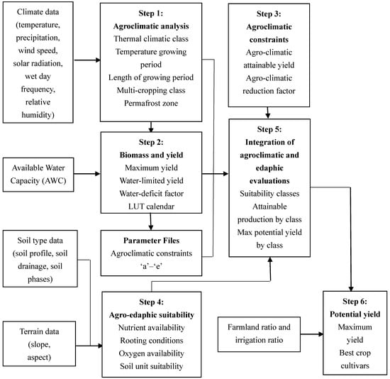 Step (1). Seven climatic variables are prepared to be interpolated to 10 km spatial resolution grid and then input to the model, which provide the basic for the calculation of soil water balances and agroclimatic indicators relevant to plant production. Agroclimatic indicators include wind speed at 2 m height [30], reference and actual evapotranspiration [31], snow balance calculation, etc. Then, the thermal regimes are determined by the climatic variables and indicators, including thermal climates, thermal zones, temperature growing periods (LGPt), temperature sums (Tsum), temperature profiles, permafrost evaluation, and potential cropping system.