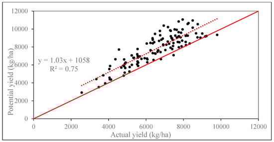 The simulated potential maize yield of each city in Northeast China for three years was compared with the actual maize statistical yield from Statistical Yearbook to verify the precision of the GAEZ model simulation results, and the regression relation between potential and actual yields was set up (Figure 3). The coefficient of determination (R2) was 0.75, indicating that potential and actual yields have a good correlation (Figure 3). Therefore, the trend of simulated potential production was consistent with the trend of actual production. The overall results show an appropriate capability of the GAEZ model to simulate maize potential yield.