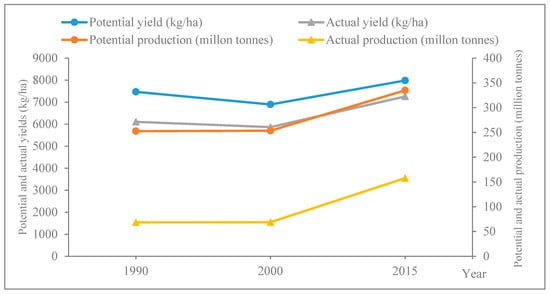 Changes of maize potential and actual yields and production in Northeast China from 1990 to 2015.