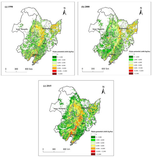 Maize potential yield from 1990 to 2015 in Northeast China. (a) 1990; (b) 2000; (c) 2015.
