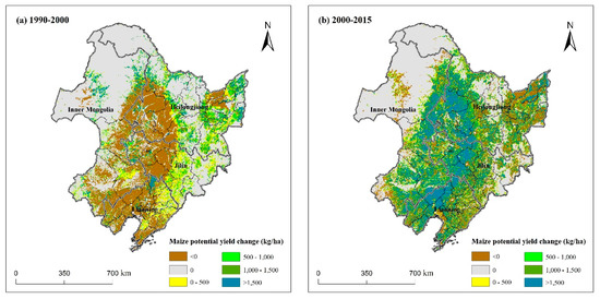 Maize potential yield changes from 1990 to 2015 in Northeast China. (a) 1990–2000; (b) 2000–2015.