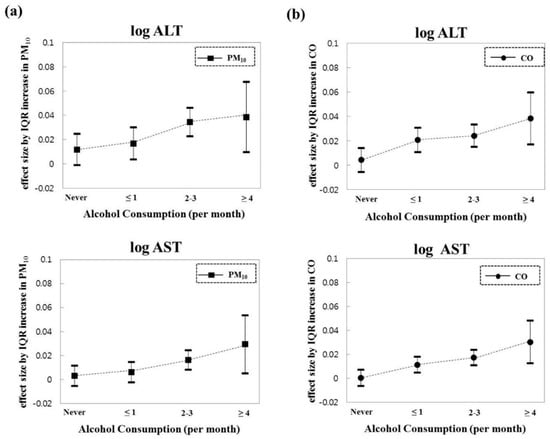 In Table 4, differences in the association between air pollution and liver enzyme levels according to the alcohol drinking status, especially in PM10 and CO, are demonstrated. The effects of PM10 and CO on liver enzymes through stratification of alcohol consumption level has also been identified, as shown in Figure 1. The effect size of PM10 and CO on log ALT and log AST levels gradually increased along with the monthly frequency of alcohol consumption.