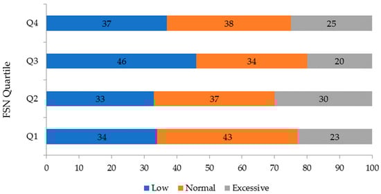 The energy intake of the participants was not associated with the weight of the newborn but was indeed related to the size of the FSN, as was demonstrated when comparing the average amount of energy intake within all quartiles, where the energy intake was higher in quartile 4 (p = 0.020). This could be due to the positive effect exerted by a larger FSN on the quantity and quality of the diet [], as well as on other factors related to the consumption and expenditure of energy, for instance stress [], which could be common in low-income adolescent women.