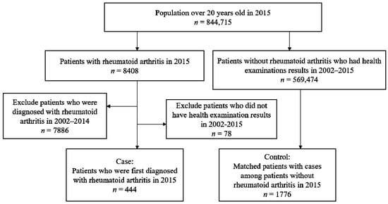We obtained the study population data from the NHIS-NSC between the years 2002 to 2015. From the NHIS-NSC data, we identified 844,715 participants who were over 20 years old in 2015 (Figure 1). We identified the diagnosis data from the patients’ medical treatment based on the International Classification of Diseases, 10th Revision code. Specifically, our main outcome variable was ICD-10 codes corresponding to seropositive rheumatoid arthritis (M05, M050, M053, M058, M059), and the patients who had these ICD-10 codes are considered as RA patients. In this study, we only included patients who had been diagnosed at least once with RA in 2015 (n = 8408). In South Korea, the reimbursement criteria for patients with RA between 2009 to 2013 could affect the incidence of RA []. Therefore, we excluded the patients who had been diagnosed at least once with RA in 2002–2014 in order to identify recent incident cases of the disease in 2015. Consequently, the remaining population consisted of 7886 subjects.