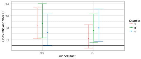 Although we could not find dose–response patterns by exposure level quartile, O3 showed dose–response patterns in the two-pollutant model for both CO and O3. The risk of RA was increased even more (1.59-fold) in the highest quartile of O3 exposure.