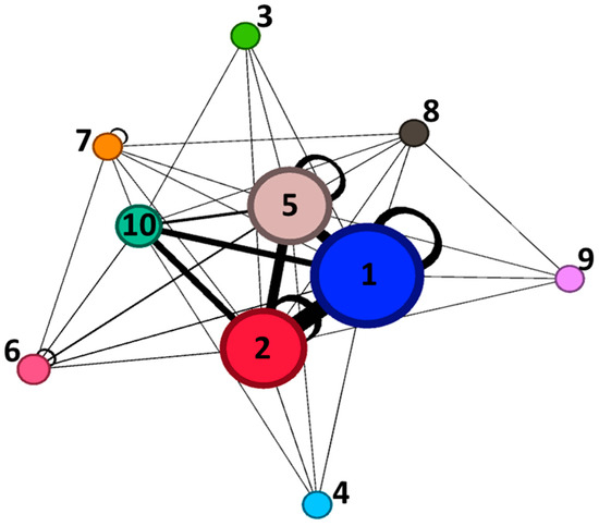 Pictorial representation of the distribution of electric networks in the analyzed dataset and their interconnections. Nodes (circles) represent the electric networks. Node size is proportional to the number of children in the dataset living or going to a school near that particular electric network. A link (straight line) between electric networks “A” and “B” means that there are some children in the dataset whose home or school is near both “A” and “B” networks at the same time. Loop links represent children that are near to only one single type of electric networks. Link thickness is proportional to the number of children for which the link is valid. Numbers in or next to the nodes are the type of electric networks: 1 = UND_low; 2 = UND_mid; 3 = UND_high; 4 = UND_extra; 5 = OVHD_low; 6 = OVDH_mid; 7 = OVHD_high; 8 = OVHD_extra-high; 9 = OVHD_ultra-high; 10 = substations.