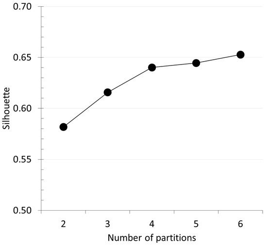 Figure 2 shows the average silhouette score (see Equation (3)) as a function of the number of clusters used for partitioning the matrix of 1793 × 11 real data. It is possible to see that the score increases as the number of partitions increases from two to six. The increase is steep up to four clusters; at five and six clusters, there is still an increase, but it is minimal if compared to the increase observed from two to four clusters. This means that, using five or six partitions, the quality of the clustering solution would not significantly be better than that obtained with four partitions.