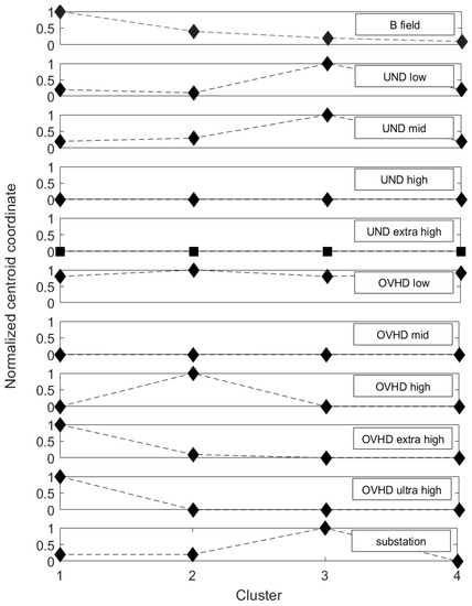 From Figure 3, it can be seen that the coordinates of the centroids along the variables UND_high, UND_extra-high, OVHD_low, and OVHD_mid did not vary across the clusters; this means that, on average, data across the different clusters did not show significant differences along these variables. We can thus conclude that these latter variables did not contribute to differentiating the clusters. From a practical point of view, this means that the number of underground networks of high or extra-high voltage and the number of overhead lines of low or mid voltage near home or school were not relevant, alone, to differentiating the characteristics of the four clusters (i.e., the four patterns of exposition).