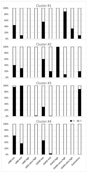 Within cluster analysis. Black bars: Percentage of measurements within each cluster from children living (or going to schools) near underground cables, overhead lines, and substations. White bars: The complement to 100%.