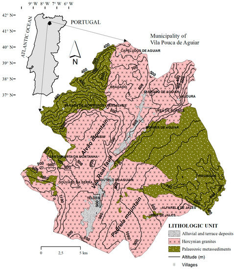 The region of Vila Pouca de Aguiar is located in the north of Portugal and occupies an area of approximately 437 km2 (Figure 1). The morphology is characterized by large-scale tectonic valleys associated with the Vila Real fault. These valleys are surrounded by the Alvão (to the West) and Padrela (to the East) mountains. Altitudes range from a minimum of 320 m in the northern valleys to a maximum of 1130 m up in the mountains. The geology is characterized by Hercynian (syn- to post-tectonic) granites that intruded Palaeozoic (Cambrian to Devonian) metasediments and were covered by Quaternary alluvial and terrace deposits along the Vila Real fault. In the Southeast part of the area, occupied by an extensive outcrop of metasediments, a geological structure was defined, in which tectonic laminae are folded and separated by major thrusts [16,17].