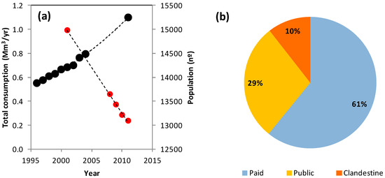 (a) Consumption of groundwater in Vila Pouca de Aguiar in the period 1995–2011, based on municipal records. Evolution of resident population in the period 2001–2011 (https://www.pordata.pt/). (b) Groundwater consumption as function of type: paid by residents, public use (unpaid) and clandestine or related to network losses.