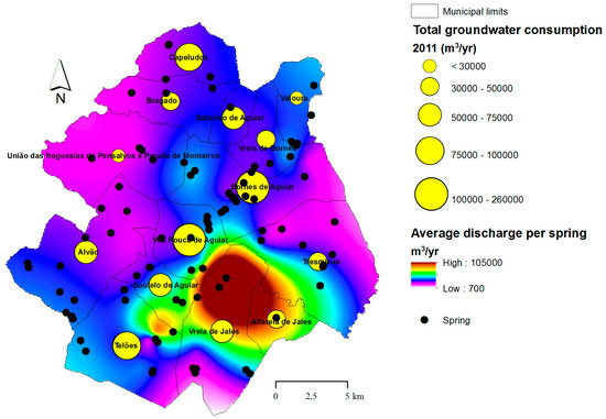 The spatial distribution of total consumption is portrayed in Figure 6. Approximately 40% of all groundwater consumed in the municipality occurs in the capital (Vila Pouca de Aguiar) and Bornes de Aguiar/Pedras Salgadas town, which is a consequence of population concentration in the larger villages. A thorough inspection of this figure reveals a striking reality. The water consumption in villages from the Jales plateau (Vreia de Jales and Alfarela de Jales) are included in the lowest category (< 30,000 m3/yr), while this region is located where springs can naturally discharge over 100,000 m3/yr of shallow groundwater. In opposition, consumption in Vila Pouca de Aguiar (≈ 257,000 m3/yr), Bornes de Aguiar/Pedras Salgadas (≈ 200,000 m3/yr), Capeludos (≈ 89,000 m3/yr) and Telões (≈ 85,000 m3/yr), are included in the highest categories, while these villages are located where average spring discharge is low (5000–20000 m3/yr).