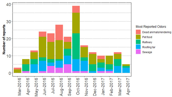 Figure 1 shows the monthly reporting from March 2016 to April 2017 for the most reported odors in North Denver. The monthly reporting was higher between May 2016 and October 2016, then dropped significantly after October 2016.